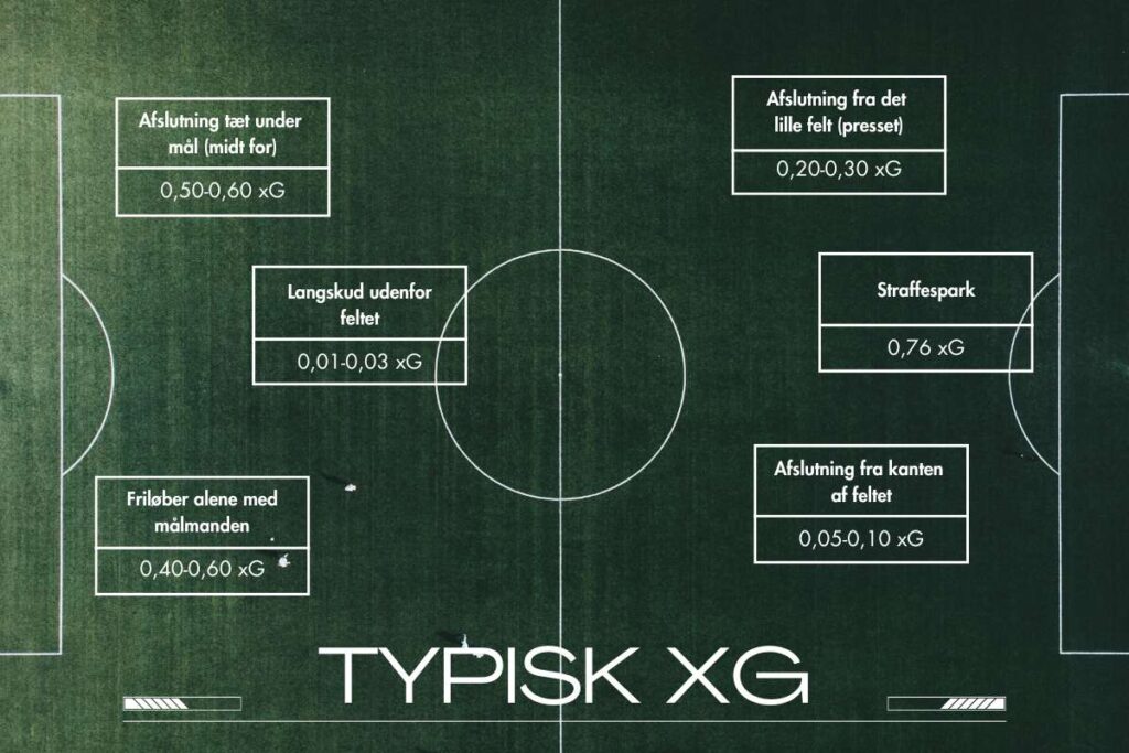 En afslutning tæt under mål midt for kan fx have en xG på 0,60 (60% chance for mål), mens et langskud fra 30 meter ofte ligger omkring 0,02-0,03 (2-3%).